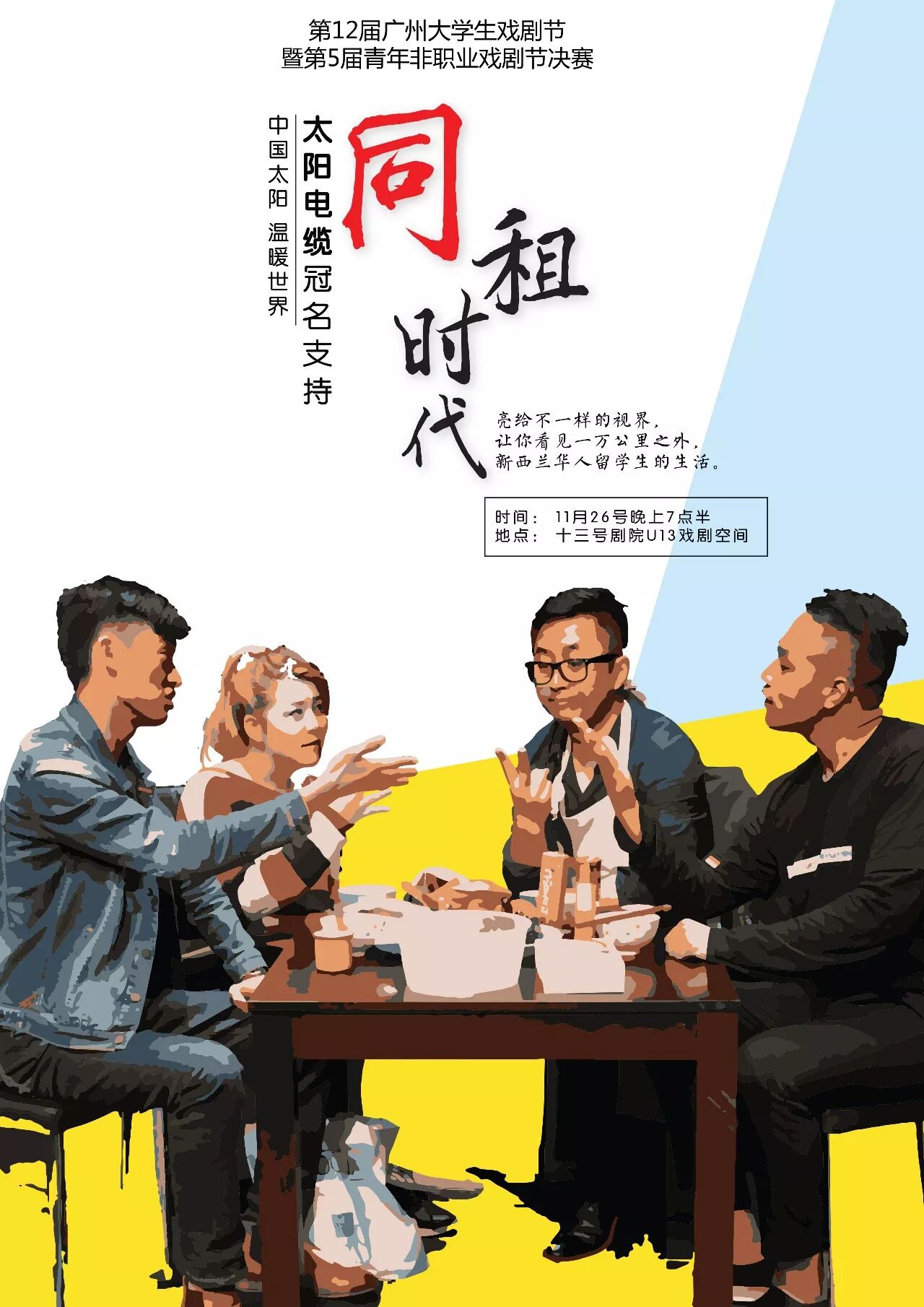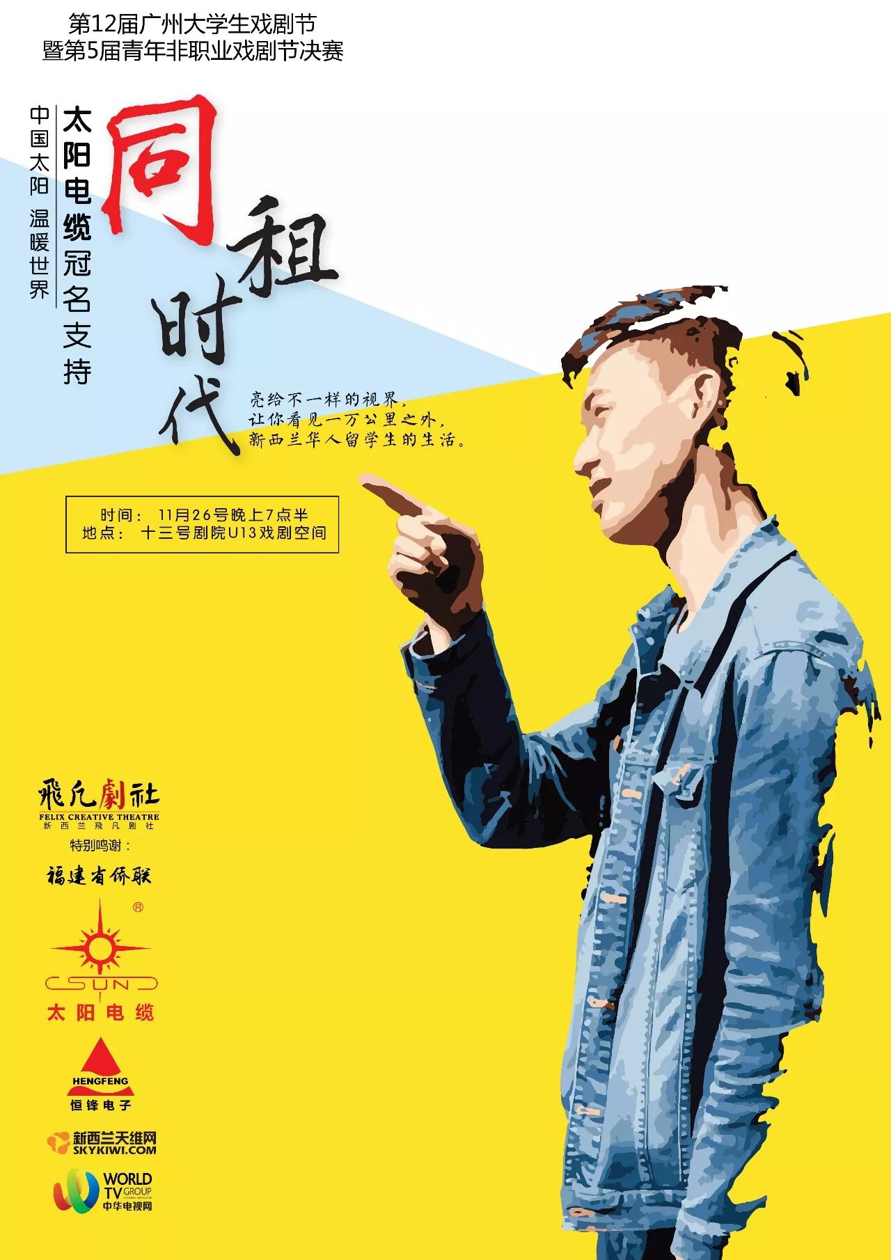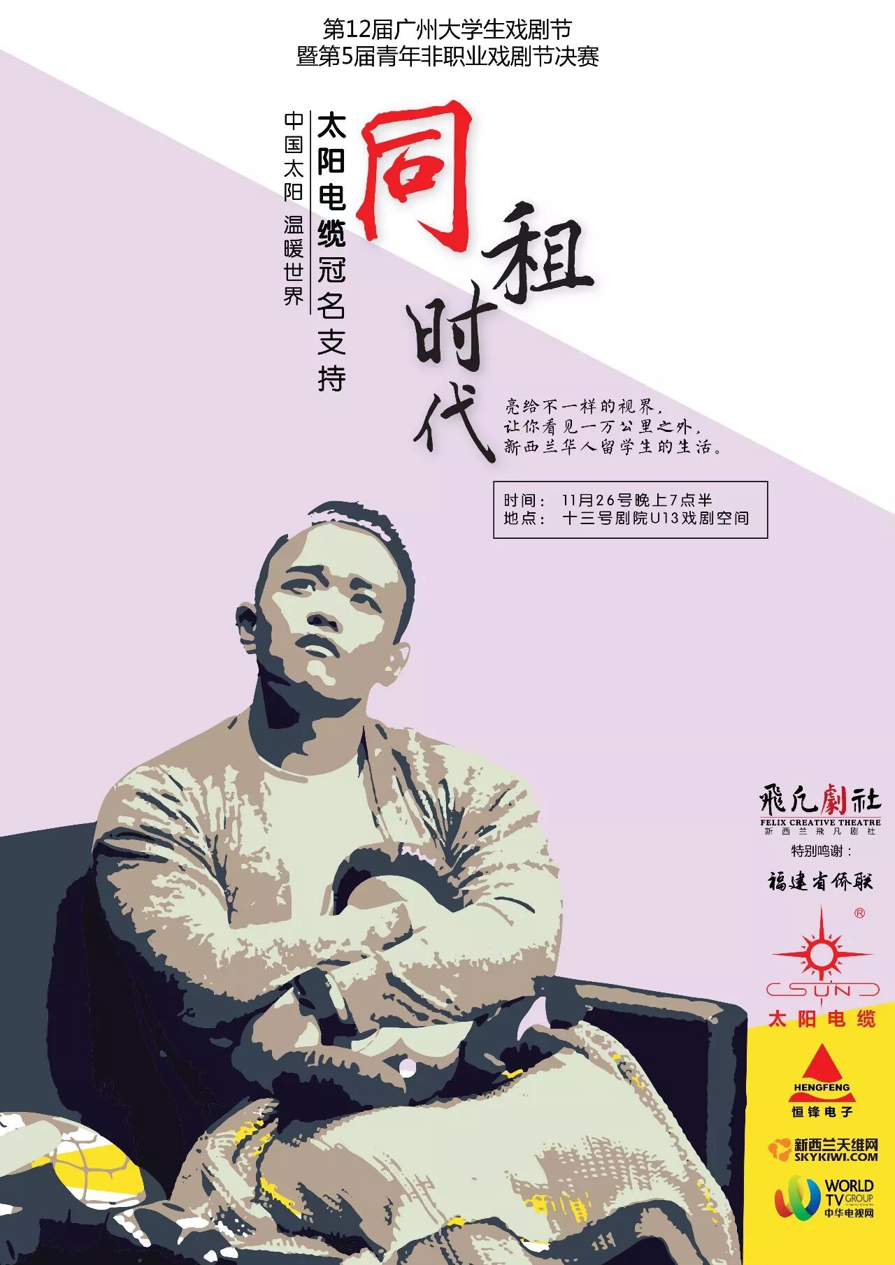 发布时间:2017-12-01 17:55:55新西兰飛凡剧社的话剧《同租时代》入围第12届广州大学生戏剧节暨第5届青年非职业戏剧节决赛,将在2017年11月26日晚上于广州十三号剧院U13戏剧空间与观众见面。《同租时代》是历史上第一个入围决赛的海外华侨团体作品,也是新西兰历史上第一个在中国参赛的华人话剧作品。