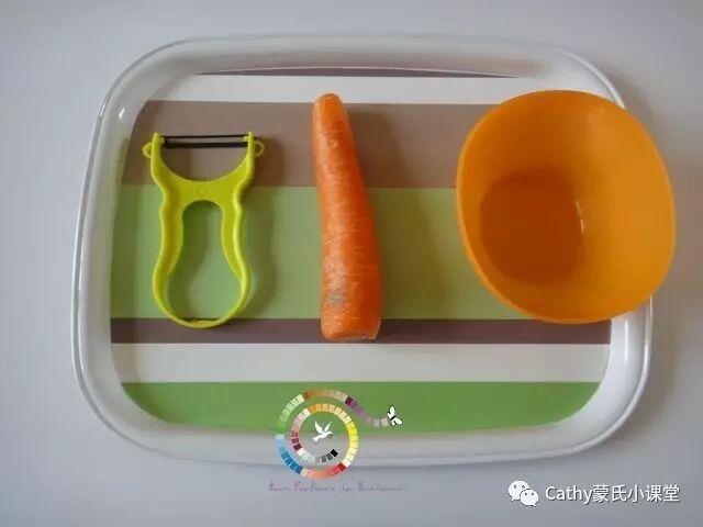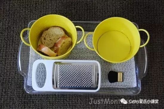 蒙氏日常生活类中的食品准备活动可以让孩子尝试,练习使用不同的工具(初次练习时需要成人的辅助)。