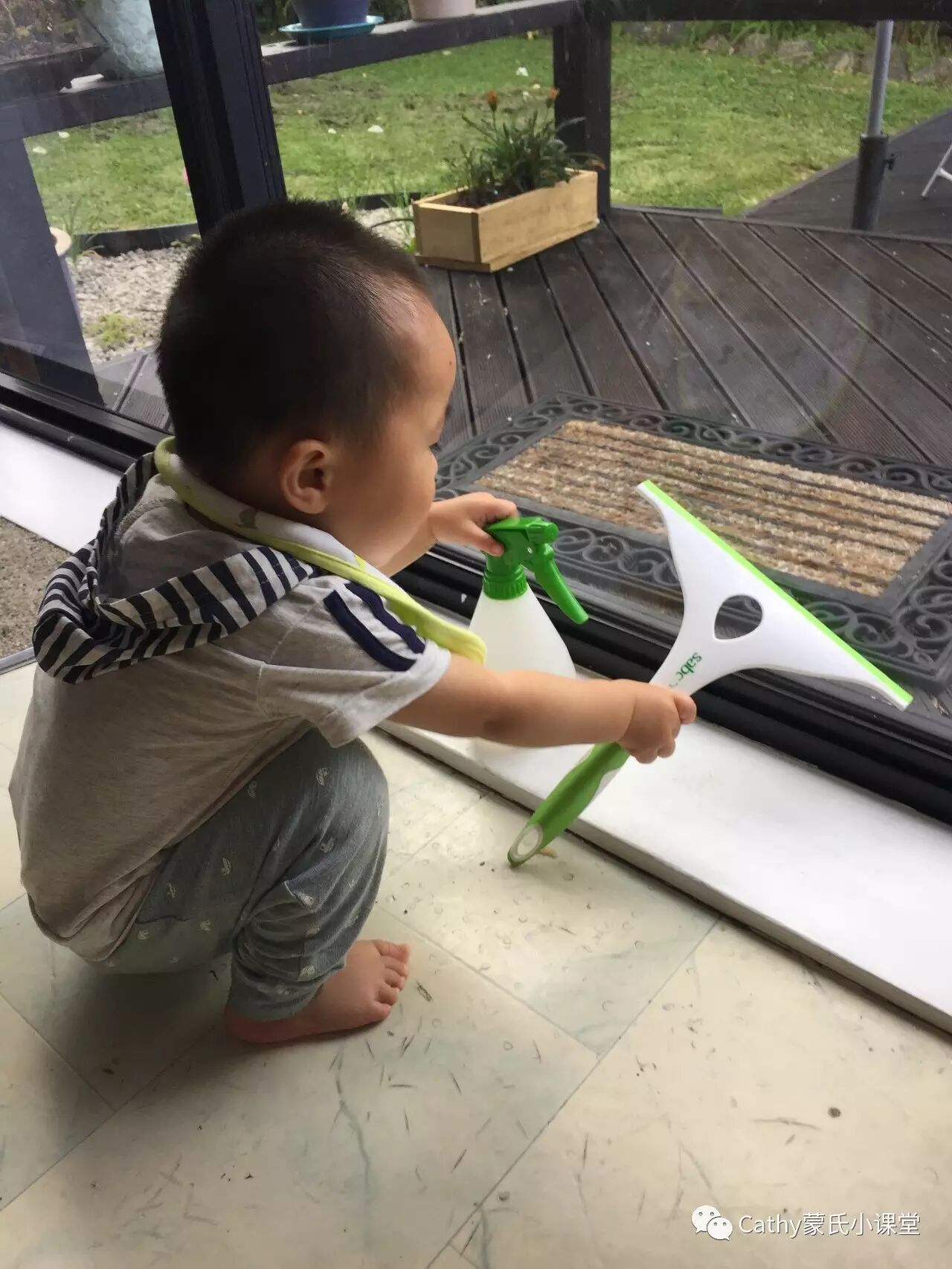 给想要学着打扫卫生的小朋友准备孩子使用的清洗工具,用水代替化学清洁用品,让他们试着扫试着擦。