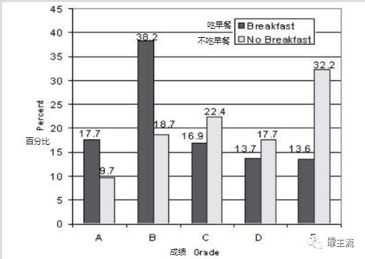 图一,对吃早餐与不吃早餐的学生成绩对比图(按照百分比分析)