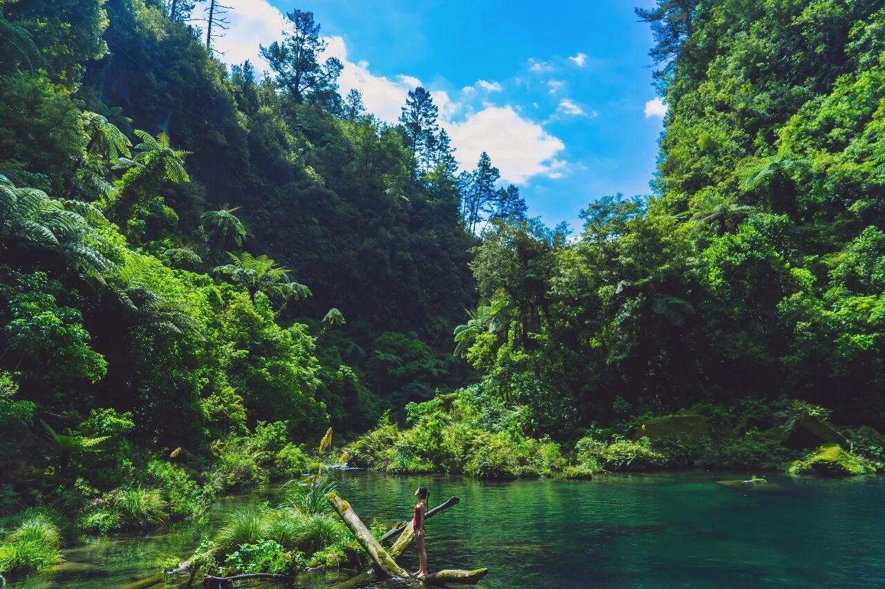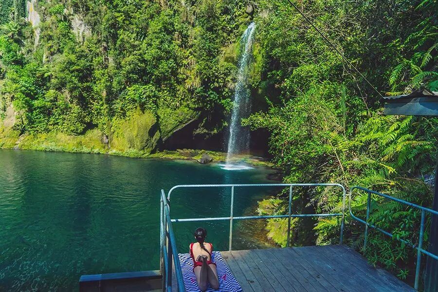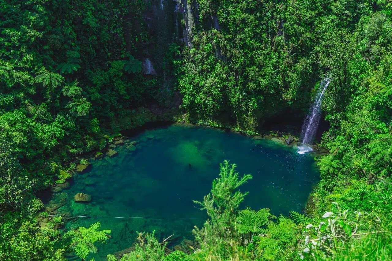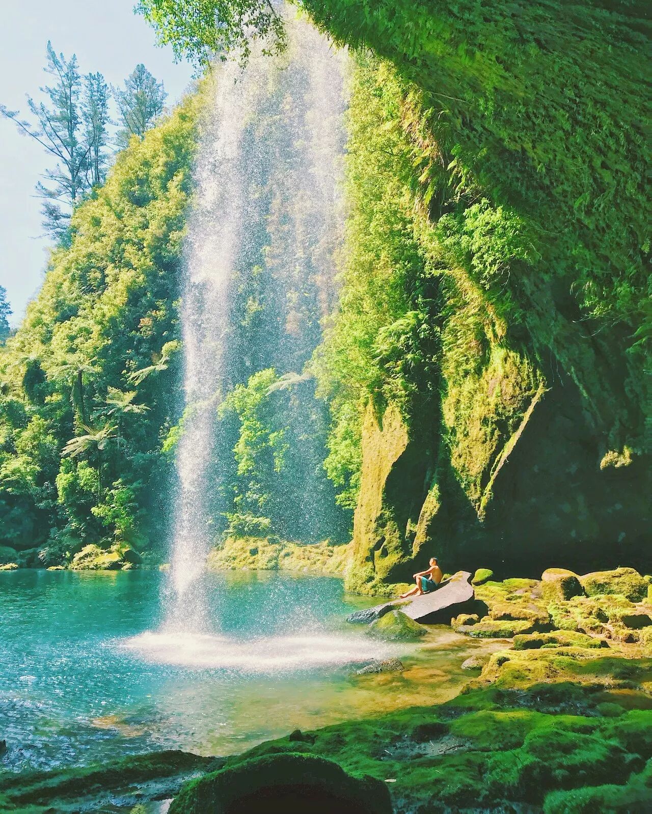 和新西兰的多数瀑布一样,这里的水流并不算太大,但由于这里观光的游客甚少,水质清澈见底,阳光直射入这座山谷,整个水潭宛若一颗蓝绿色的宝石,璀璨动人。