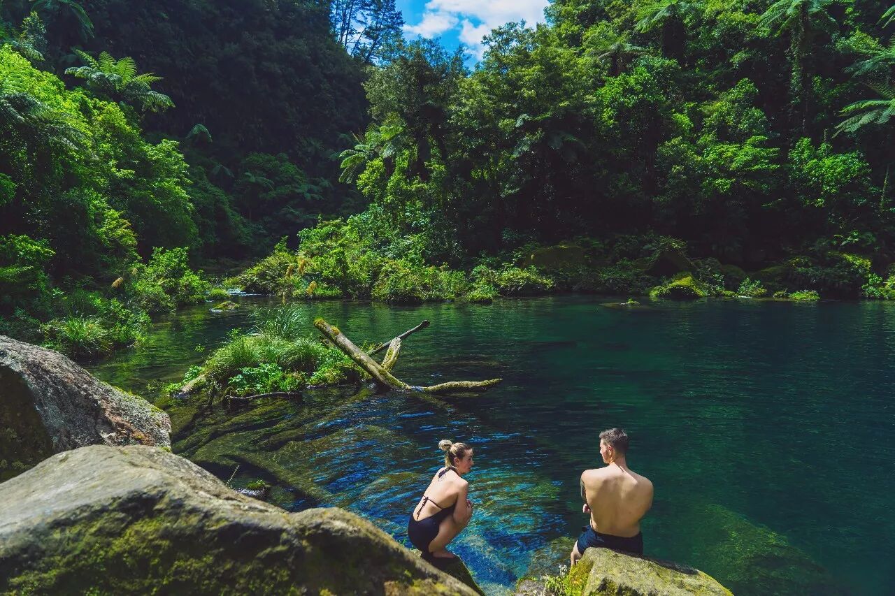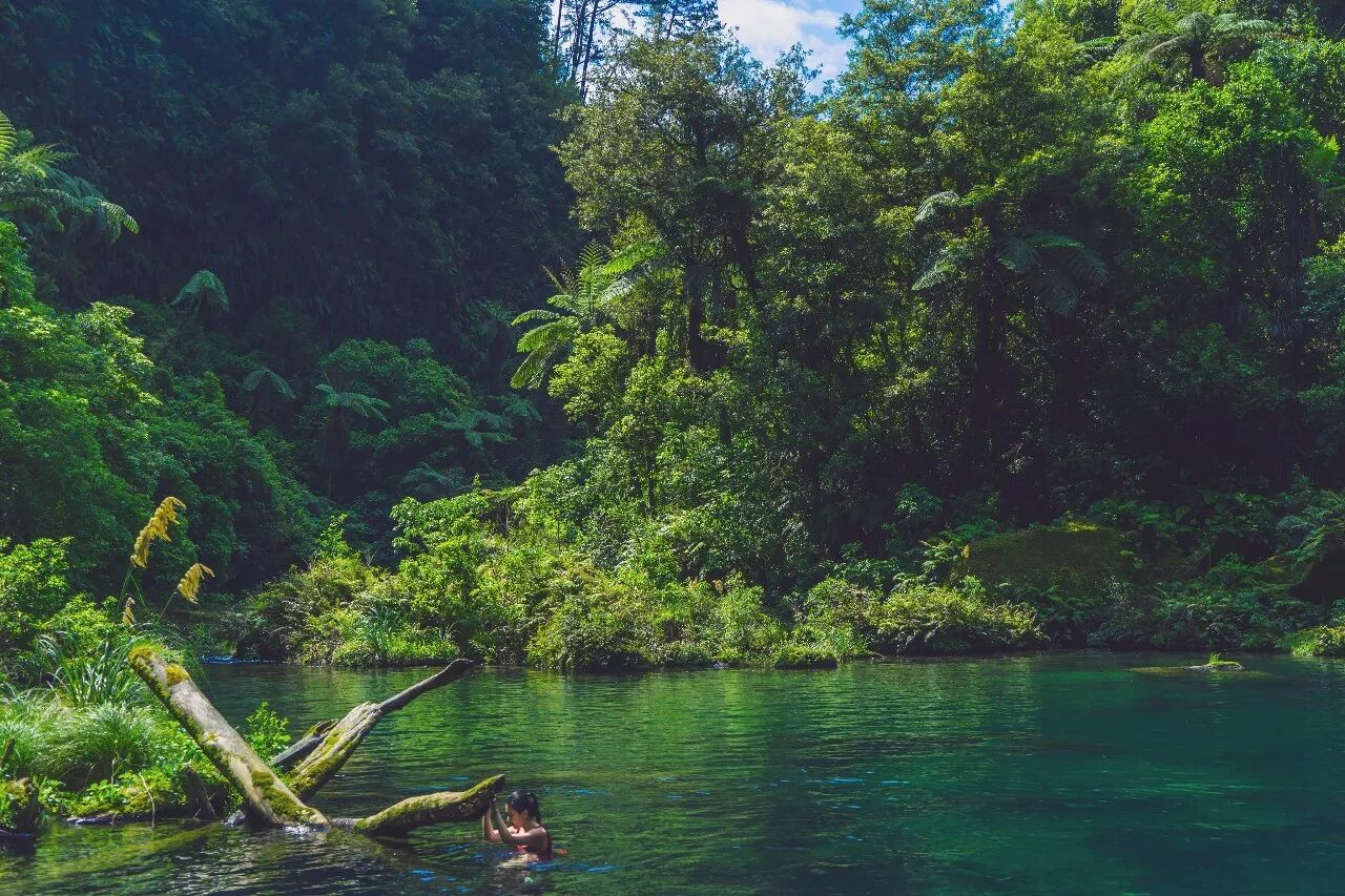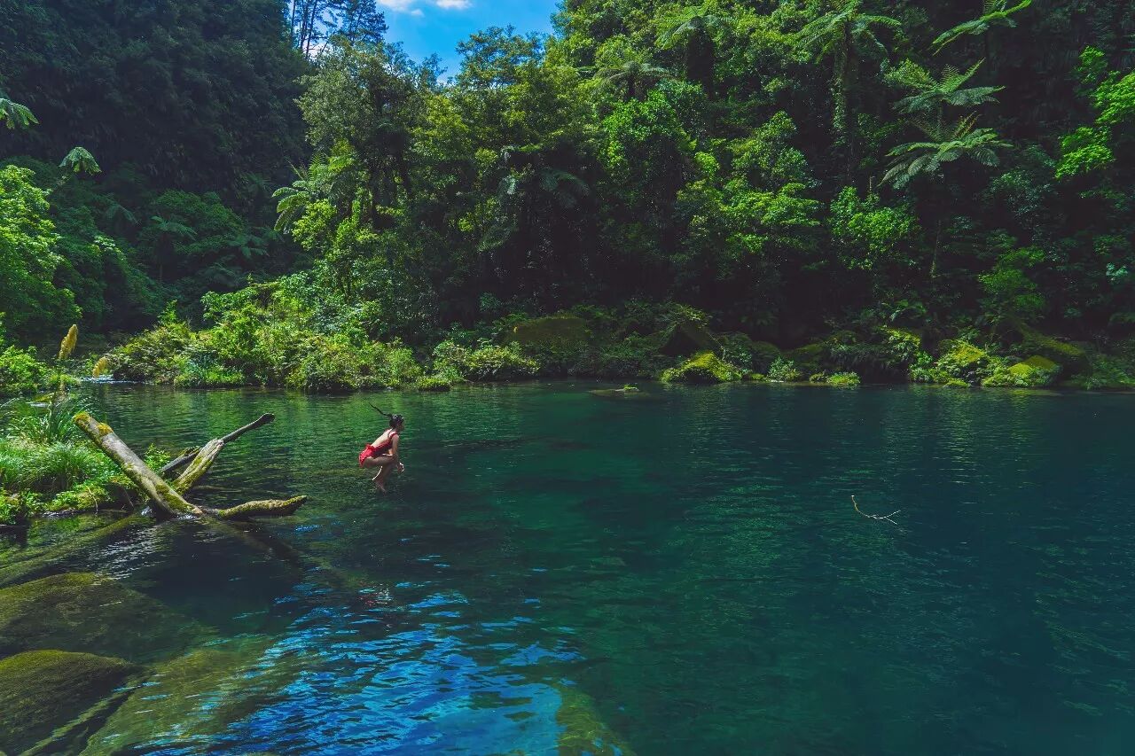 我迫不及待的把衣服脱到只剩下泳衣,然后一个助跑“噗通”一声跳进蓝绿色的水中。冰冷的潭水冻的我一激灵,瞬间从脚尖麻到了头皮!但随之而来的,却是一场前所未有过的兴奋感。Max说,那一瞬间觉得我彻头彻尾的成了一个kiwi。