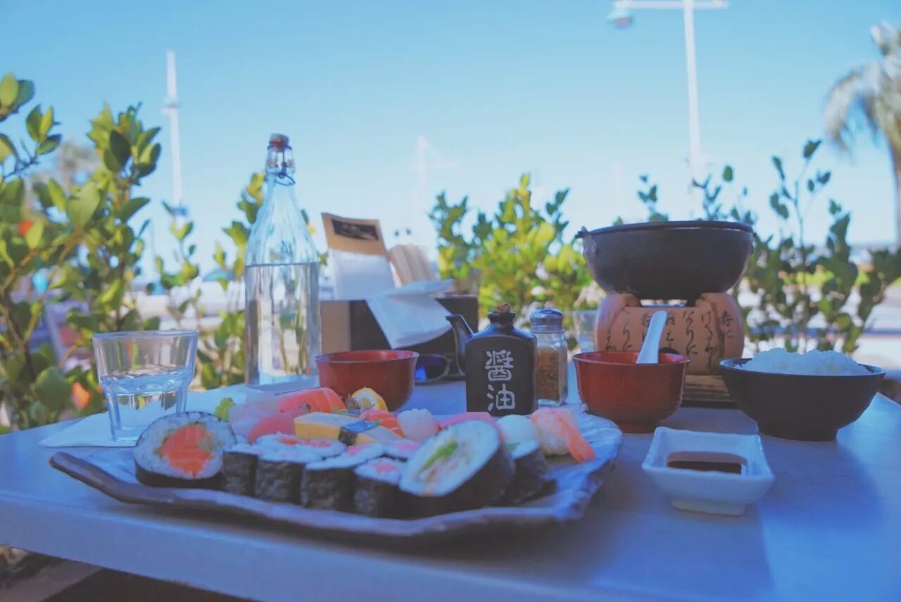 沿着海岸线,是一条长长的铁轨,浪漫的好像日本电影中的场景。我们坐在海边的日料店,一边填补饥肠辘辘的胃,一边欣赏着眼前的静谧,仿佛连说话都变得吵闹了。