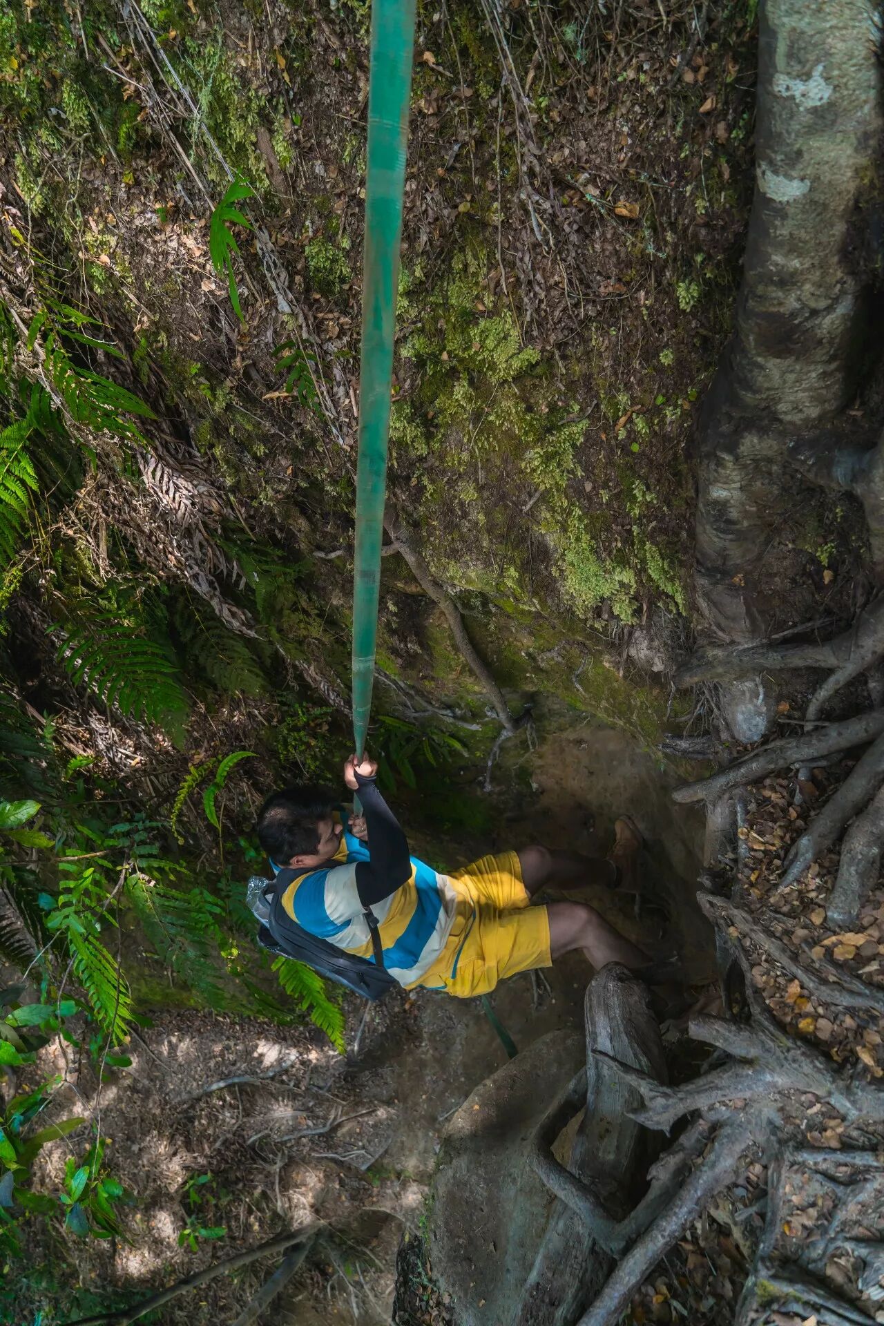 有一处完全无法下行的小道上,居然还有人暖心的留下了一条攀岩绳,这可帮了大忙!