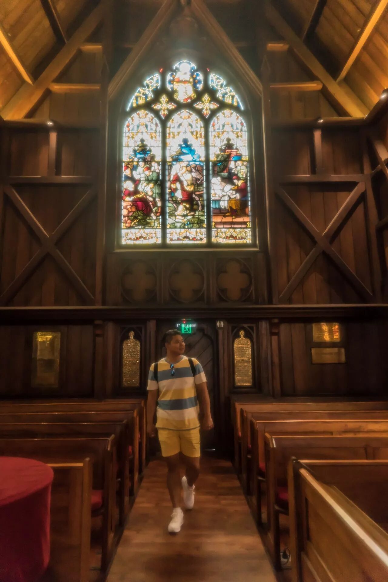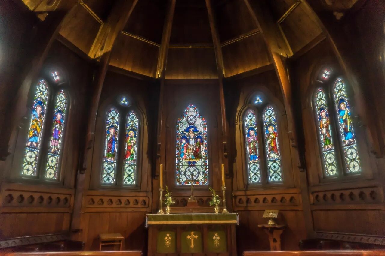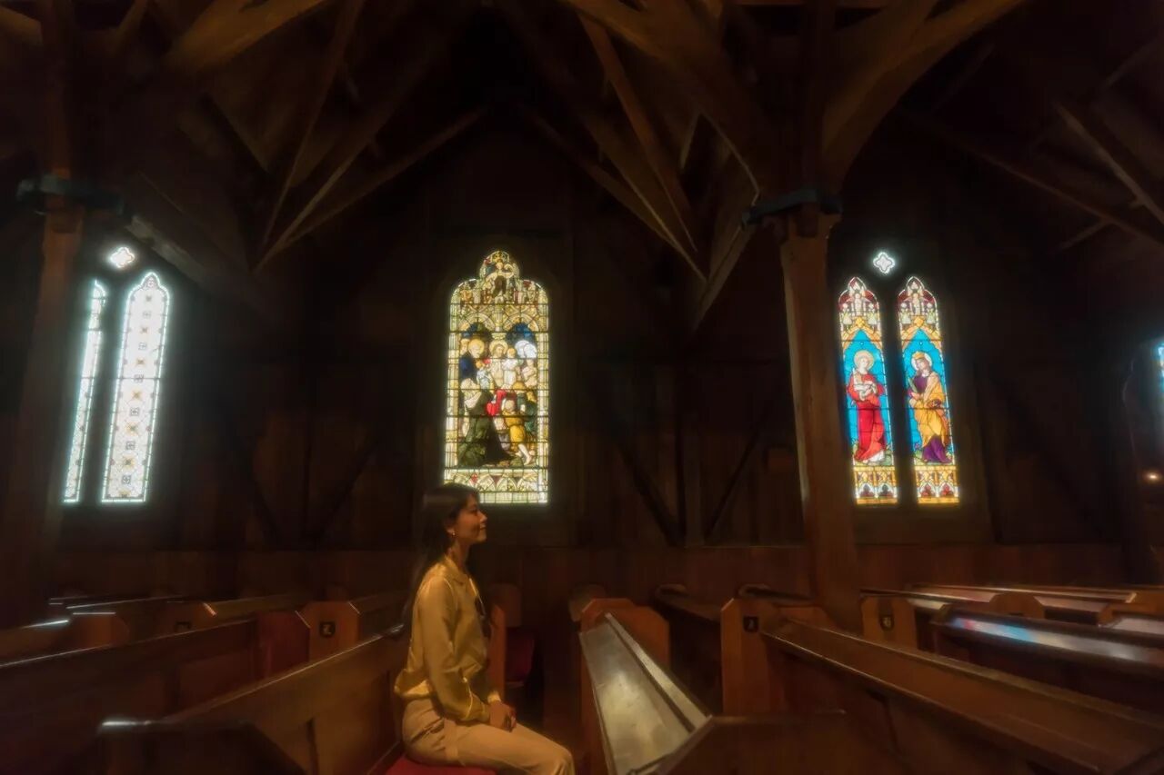 你可以盯着教堂里的每个角落看上很久,尤其是一扇扇琉璃窗,阳光透过它们照射进来,教堂内洒满一层柔和的金光,就连呼吸声都变得清晰起来。