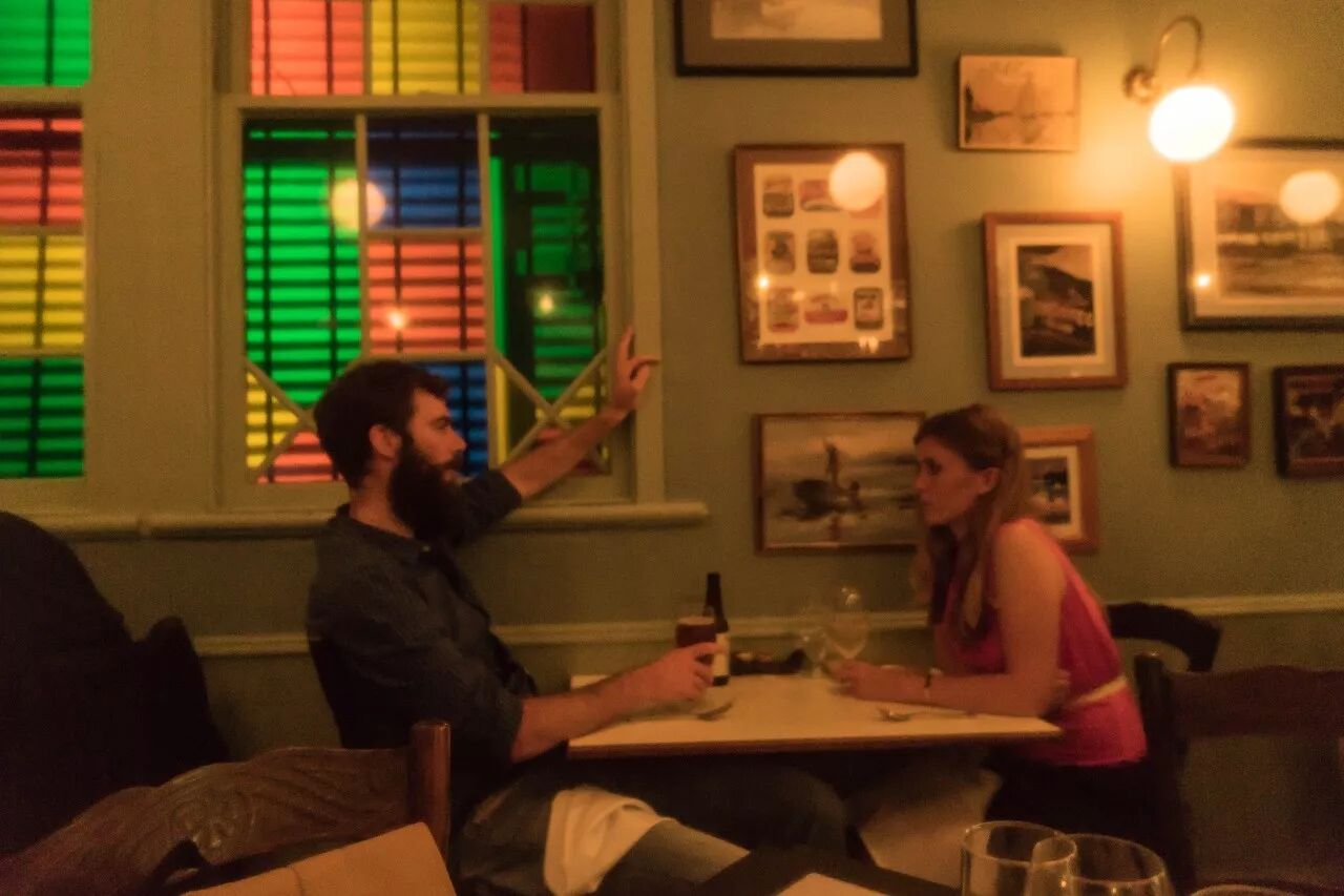 墙面被粉刷成了清新的绿色,装点着有趣的老照片和五彩斑斓的玻璃窗。对面的一对情侣表情夸张的聊着天,完全就是电影中的画面。