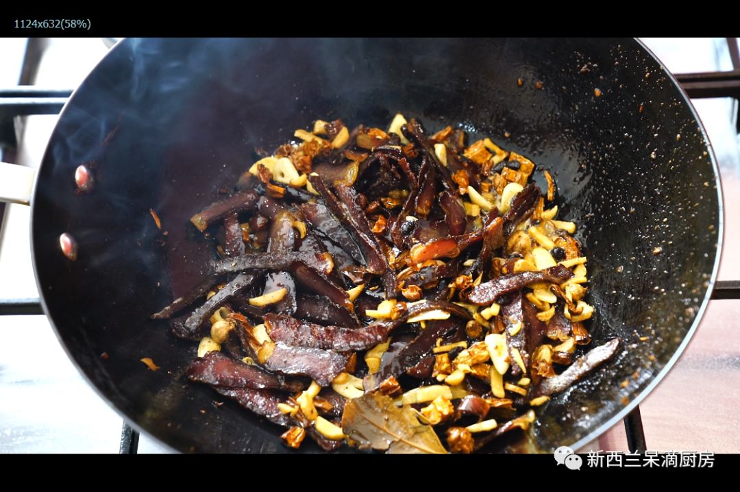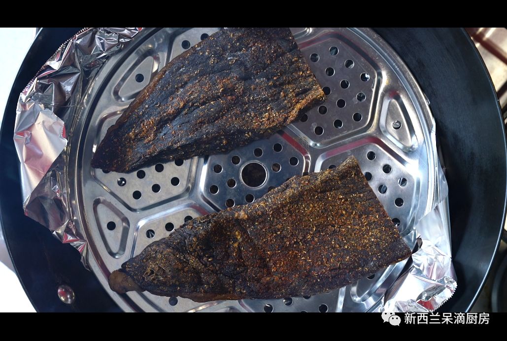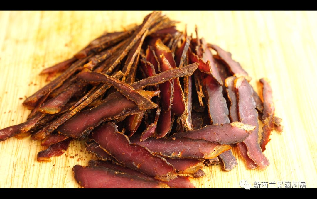 不卖关子了,食材揭开了一点都不神秘的面纱,其实就是BILTONG,这是一种南非风味的干牛肉,使用了相当多的香料。只需要进行一点烟熏的加工,就可以获得跟家乡腊牛肉差不多的风味。甚至有的地方也会直接有烟熏风味的BILTONG出售,那么直接使用就可以了。如果烟熏的话,在锅里垫上一张锡纸,撒一些木屑,香料和糖,然后开小火烟熏BILTONG大概15分钟,然后关火放凉就可以了。