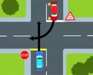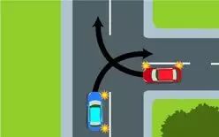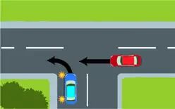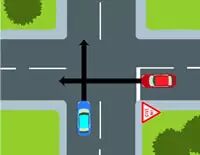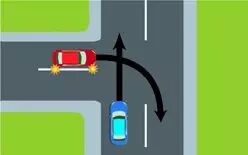 2. 如果你正驾驶蓝色车辆在T字路口的上部直行,那么这辆右拐的红色车辆因为要穿越您的车道而需要给您让行。