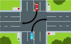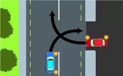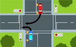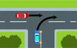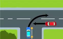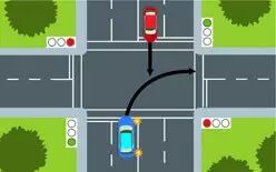 4. 您正驾驶蓝色车辆准备右拐,而红色车辆正从前方驶来并且直行,这种情况下您需要让红色车辆先通过之后您才能拐弯。