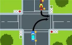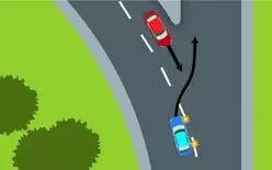 11. 在一个为未受管控的路口(例如大部分的建筑物车道出口或者公共停车场的出口),两辆车都在右拐,这种情况下,出车道的车要给正常路面直行或者拐弯的车让行。因为这种路口视同为T字形路口,下部的车辆要给上部让行。此图中,红色车辆要给蓝色车辆让行。