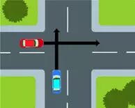 9. 在未受交通标志和路面画线管控的十字路口,红色和蓝色的车辆都在直行,这种情况下,红色车辆需要给蓝色车辆让行,此时适用“让右”原则。