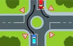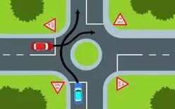 16. 在环岛处,车辆需要给来自右边的车辆让行,因此,蓝车需要给红车让行。