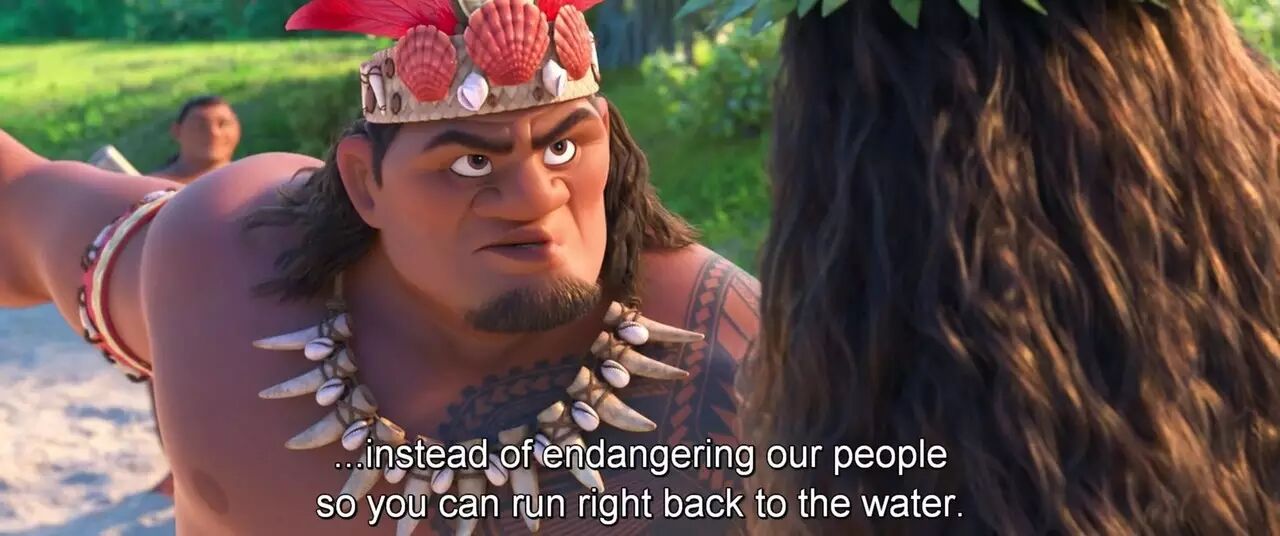 当近海开始捕不到鱼,Moana提出要出海,她爹因此大发雷霆。