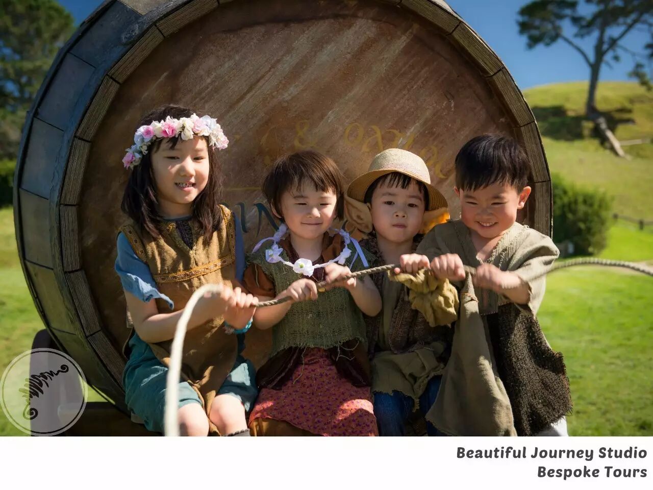 ^ 打扮成小小霍比特人的孩子们驾着马车