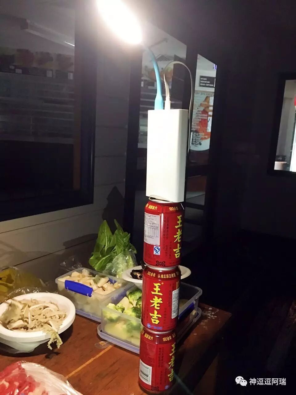 照明:这次用的是小米台灯插在小米充电宝上,火锅照明灯组合不仅不费电而且照明度比想象中的好,可以一边放一个来减少阴影部分。