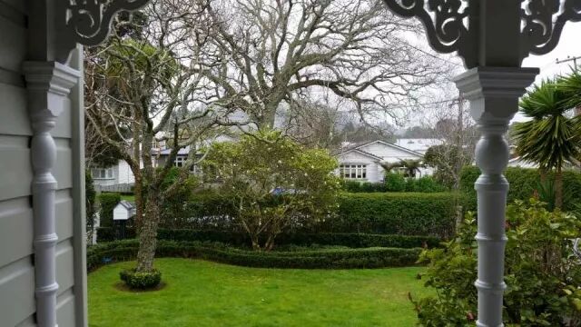 房子是1907年建的,老Villa样式,浅灰色的外墙加蓝色的屋顶,搭配白色的回廊栏杆、白色窗框和白色屋檐雕花。木地板全是现在已受保护的漂亮的贝壳杉和RIMU铺就的。这些百年地板,你能明显看到上面的火钎子痕迹(据老刘说:那是百年前施工时,匠人直接用烧红的火钎子把链接部位烧穿一个孔,然后用一根木钉砸进去以固定的安装方法)。房屋维护保养得不错,开放式厨房是后来改建的,但是遵循了老Villa的style,全是木框架推拉玻璃门。在早餐吧一侧的休闲区有凸出外墙的欧式飘窗,半菱形的三页窗下是白色的软垫坐台。窗户顶上的部分是铁质掐丝彩绘玻璃(有这类玻璃的屋子建议买玻璃险),显得格外优雅也极富格调。