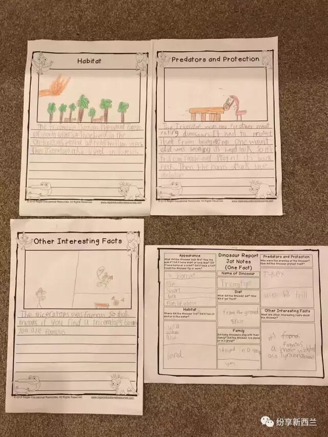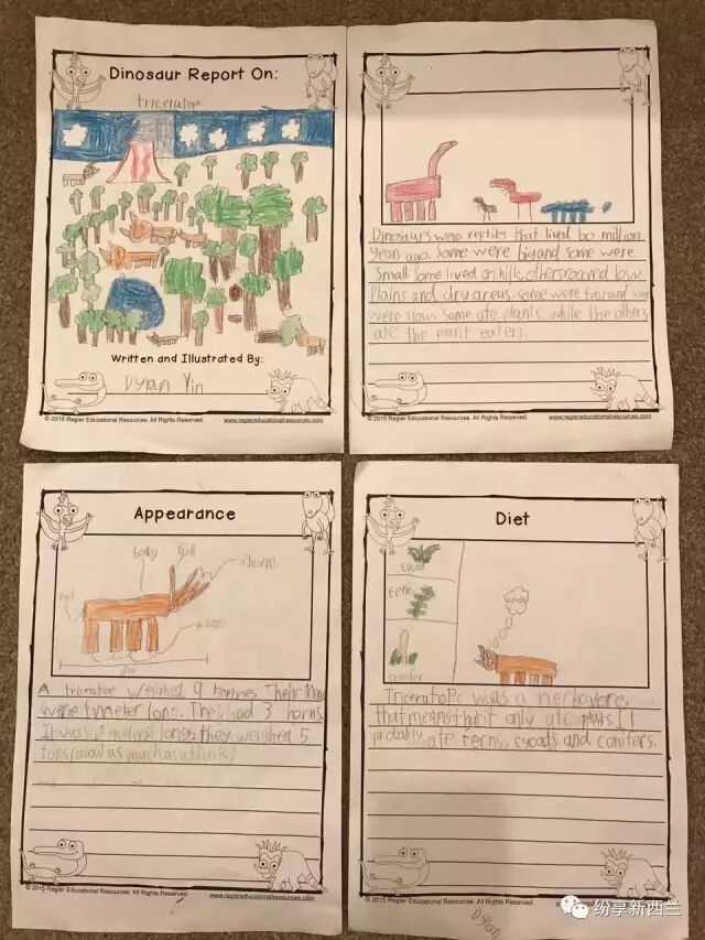 二年级开始最基础的“论文”写作。上面是一名6岁小朋友的作业,关于三角龙的研究报告。有手绘封面、封底总结,内容包括:概述、外观特点、饮食、喜好、如何自我保护和其它有趣的事等。