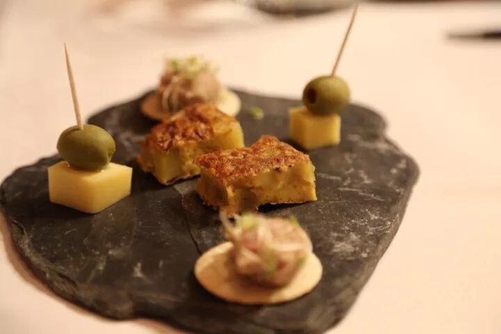 晚餐从6点半开始,客人可以先去到大堂喝一杯餐前酒,享用开胃小碟,随后在7点移至餐厅正式开始晚餐。用餐之前为客人酝酿好心情,准备好晚餐胃口。厨房当日新鲜烤制的面包配以橄榄油与黄油,意式拖鞋包的柔韧口感与橄榄油尤为配合,酵头的微酸恰是面包顶级品质的保证。正吃着,服务生端来Lodge特制的山泉水倒上,连瓶身也为酒店量身打造。听服务生介绍说,这里的地下水水质出众,所以餐厅的用水都选择本地地下水,甘甜清洌。随后奉上的餐前小食,为绿橄榄佐干酪、红薯馅饼与鸭肉卷。红薯的回甜与鸭肉卷下的脆饼印象格外深刻。