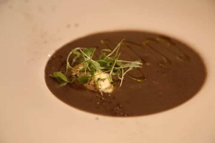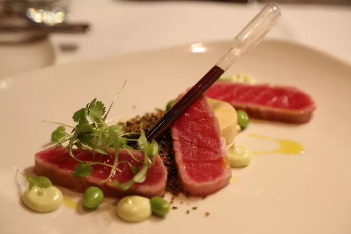 开胃菜有蘑菇汤与香煎黄鳍金枪鱼之选。蘑菇汤的原料来自本地出产的森林蘑菇,研磨得细腻可口,佐以马斯卡朋奶酪与松露油,一股原始的森香扑鼻而来,用面包蘸着吃也不赖。黄鳍金枪鱼采用了日式烹饪手法,将表皮轻轻炙烤至五成熟,鱼肉还是鲜生状态,在视线中展露出诱人的粉嫩,焦糖酱油汁可以根据自己的口感偏好淋在鱼肉上,再缀以芥末美乃滋、白味噌布丁,软嫩口感中亦有醇厚悠长的尾韵,青翠的枝豆在唇齿间留下和风清爽,色彩也格外动人。