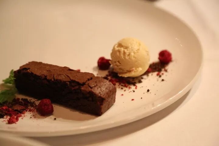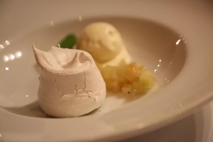 甜品选择了布朗尼与新西兰特色Pavlova蛋白饼。黑巧克力布朗尼吃着暖烘烘的,与冰凉的黄油花生味冰淇淋、蔓越莓酱汁如出一辙,在口中演绎了一出经典的对话。只是摆盘相对平淡一些,餐盘留白过多;最为期待的新西兰蛋白饼则别出心裁搭配了接骨木花冰淇淋与糖渍的苹果与斐济果,蛋白饼在新西兰本地作为一个国宝级的经典甜品通常只在特别的节日如圣诞节出现,主厨想必是要用这款甜品来向客人展示出餐厅的新西兰身份,不过比起来口感新奇又优美的接骨木花冰淇淋在整体间脱颖而出,不甜不腻,果香花香十足,吃下去犹如漫步在花丛之间,步履轻盈。斐济果也用它微酸的特别滋味中和了蛋白饼的甜度。如果有几分柑橘类水果的专属滋味与这份甜品搭配,相比会有更意想不到的效果。
