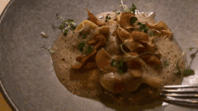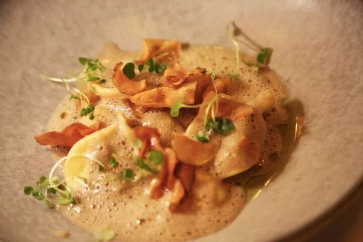 看到Toetellini的时候总会一阵心悸,这种像极了肚脐模样的意式云吞尤为讨喜,一口一个的节奏完全停不下来。蘑菇馅儿的意饺搭配的是洋姜(它有个洋气的英文名叫Jerusalem artichoke)切片烤得脆甜,泡沫状轻盈的蒜味葡萄酒汁也带着一缕蘑菇森香,在整盘中唤起南法的美味想象(吃完简直有种买张机票飞去欧洲采蘑菇的冲动啊~)