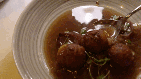不同于传统中奶酪位于碗口焗烤上桌的摆盘方式,将陈年车达奶酪做成类似于甜甜圈或是丸子模样,咸香酥脆,配上烤香红葱头与consommé法式清汤,口感清爽明亮。