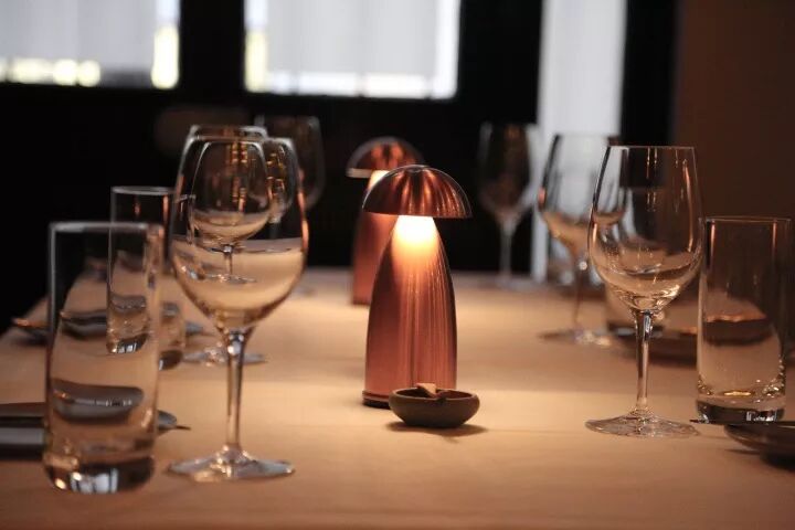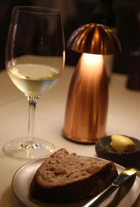 一面红墙,三幅油画,两面镜子把原本不大的空间装点得深邃有型,白餐桌搭配浅灰色布椅,源自悉尼的黄铜蘑菇灯在洁白桌面投射出柔和的光芒。帷幔半掩,用餐与喝酒的客人互为风景,电影布景一般。