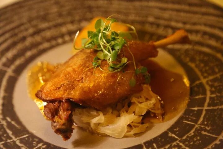 【油封鸭腿、酸白菜、黄油土豆饼、培根浓缩酱汁】