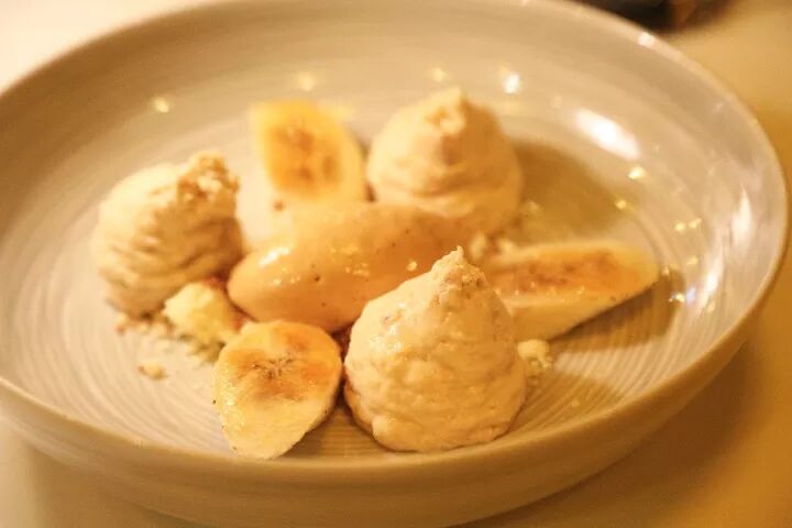 甜品端上来的时候立刻明白这是解构般的Banoffee,香蕉带着焦糖脆层,奶酪蛋糕做成可爱的泡芙状,焦糖冰淇淋更像法式酸奶油的柔润口感,画龙点睛的莫过于盘底那一层姜味的烤酥饼碎,有几分野性自然的滋味把整盘的甜味曲线拉回了平衡,回味里又有几分暖意。(姜汁与焦糖有没有格外搭调啊,记得在爱丁堡寒冷天气里吃过印象中最好吃的姜汁布丁配一盅浓稠的焦糖汁,一勺下去瞬间疗愈~)