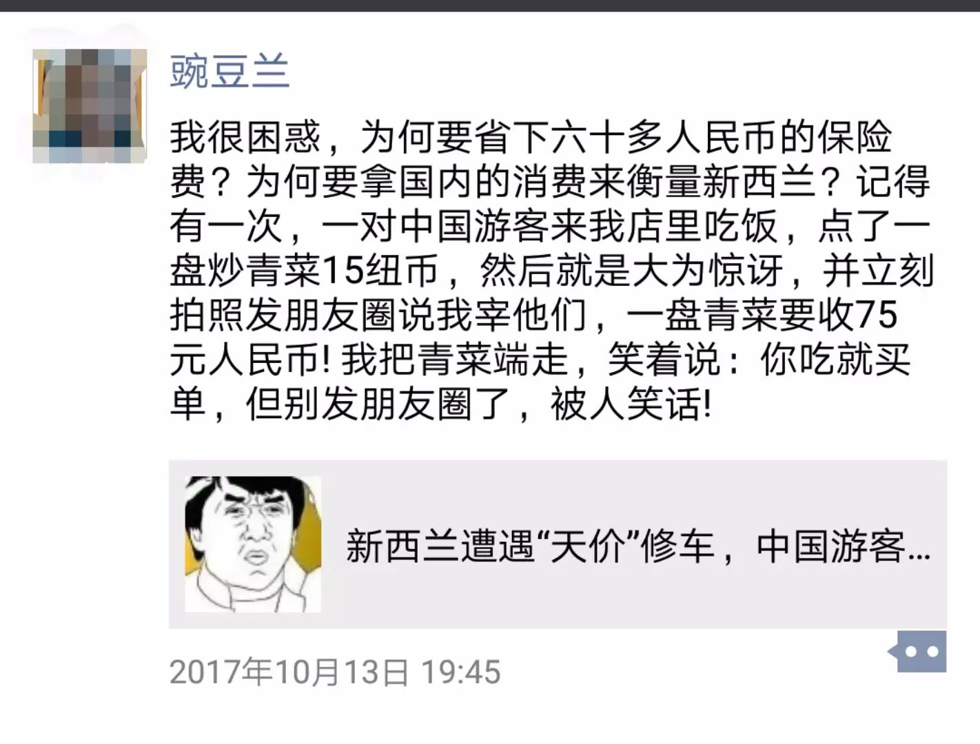 “国内生活丰富多彩,晚上都是不夜城,酒吧娱乐永不关门,物质丰富到极致。新西兰呢?太贵了,花钱乘5(指汇率)更不值。而对一个新移民,争一分钱都太难了。仅仅因为国内暂时感觉不顺,破釜沉舟,卖房举家迁往新西兰,如果将来后悔了,你就回不去了!”