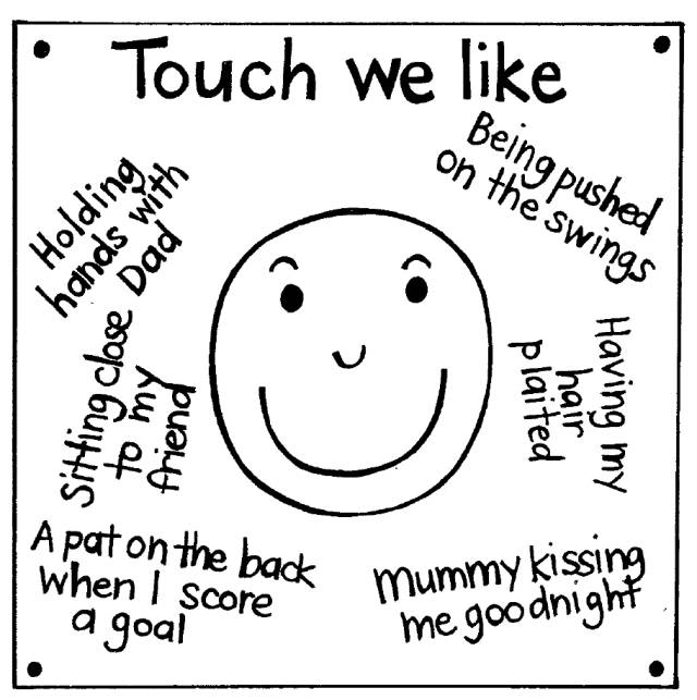 让小朋友给出自己喜欢的身体接触,例如“和爸爸牵手”“妈妈的晚安吻”“坐在好朋友身边”