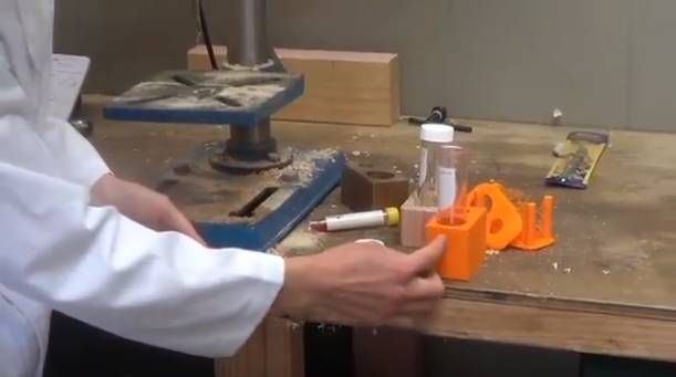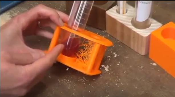 听从了用户的建议,学生们根据需求做出了进一步的改进。大试管的底槽做成了尖尖的形状,这样保证试管可以很稳定地站在那里;在连接处也钻好了洞,方便安装;学生们还做了一个基座,为了让试管架能站得更稳固。