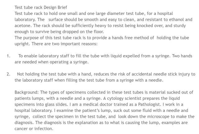在做任何设计之前,了解用户的需求是非常重要的。医生很详细地列出了“理想试管架”一些需要有的特质:例如试管架要能同时放置一个大试管和一个小试管,不能轻易被打翻,并且试管可以竖直稳固地放置...