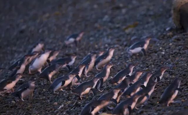 夜幕降临,小蓝企鹅会爬上陡峭的岸边,到岩壁顶上稍做休息后,再越过观赏区回到栖息地,巢中它们的伴侣或饥饿的幼鸟正在翘首以盼。