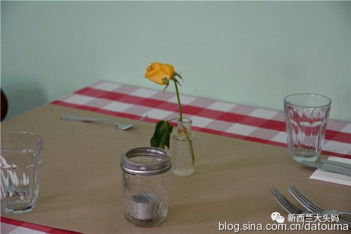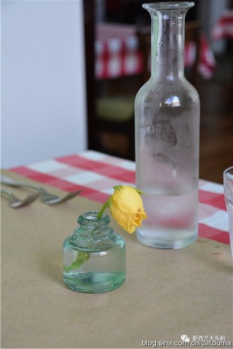 格子台布,上面是很普通的玻璃杯子甚至是罐子,插着一支黄玫瑰