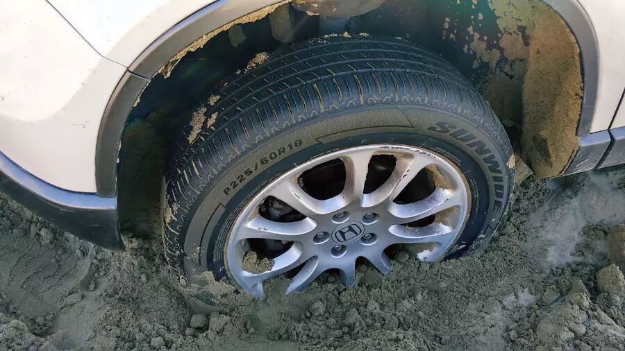 踏着前车的轮印,眼看拐个弯马上就到达海滩的出口,也许是想给我们这些不懂得敬畏自然的人一点教训吧,车子的左前轮胎就在此时陷入了松软的沙子。