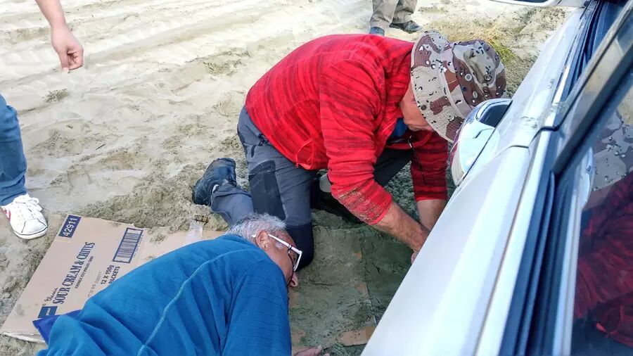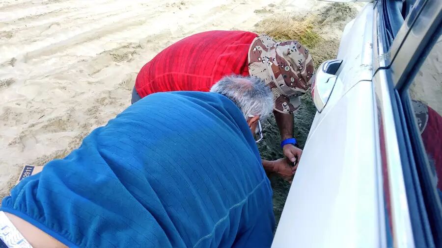 走到我们车子边上,将长枪短炮和背囊往沙地上一扔,二话不说就趴在地上查看车轮陷入的情况,菜鸟高林期间就打打下手,偶尔递个扳手千斤顶啥的也忙得不亦乐乎。