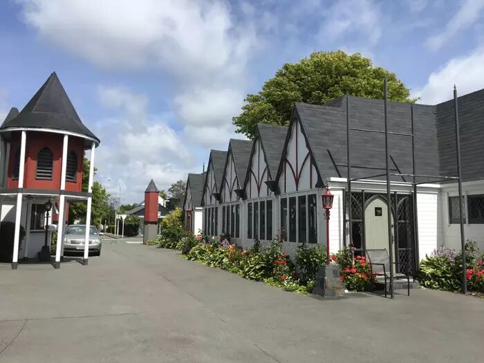 抵达基督城,我们入住一家复古建筑风格的汽车旅游,小小的汽车旅馆居然还有供住客使用的游泳池,楼房四周和道路两旁繁花簇拥。