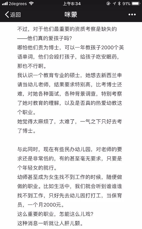 幼儿园虐童事件发生之后,咪蒙在她的推文里提到: