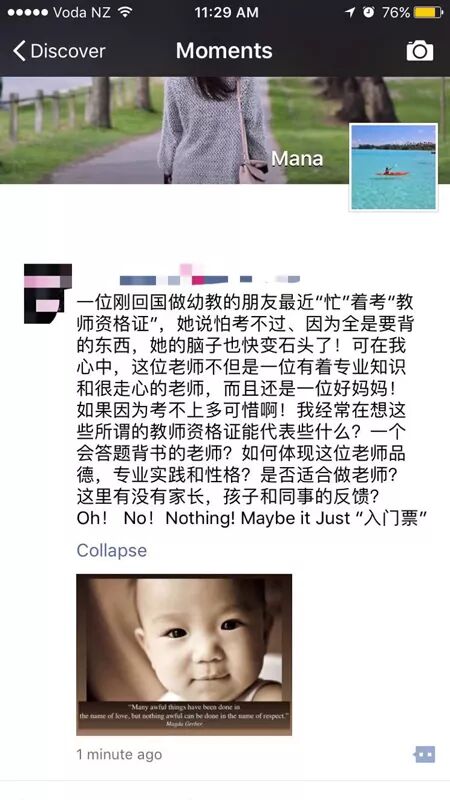 Mana在接受完我的临时采访后发来这样一幅朋友圈截图,让我感受一下国内外幼师的入门区别: