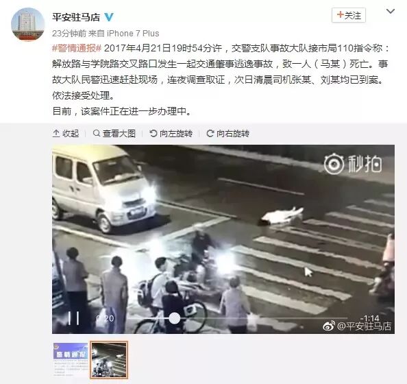 随后,交警支队事故大队接市局110指令称:解放路与学院路交叉路口发生一起交通肇事逃逸事故,致一人(马某)死亡。