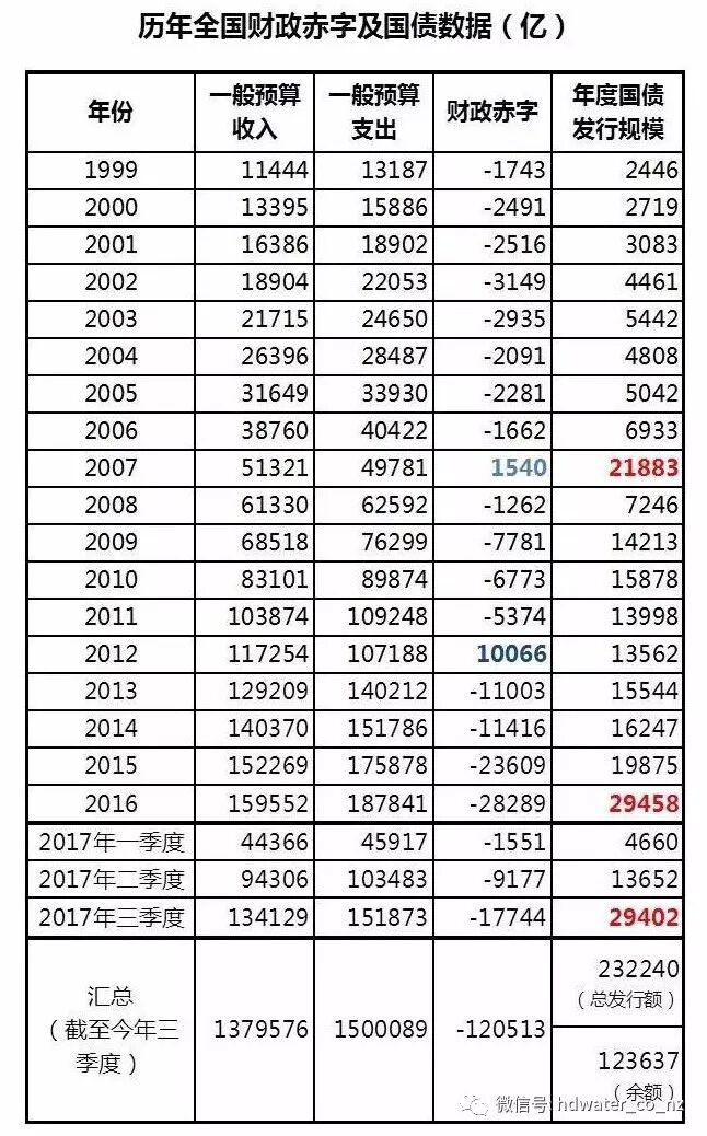 (历年国债发行总规模是23.2240万亿,累计国债余额为12.36万亿;2017年前三季度财政赤字为2.85万亿,累计全国财政赤字为12万亿, 国债发行基本与财政赤字持平, 如果理解了这一点, 就可以理解所谓增加财政支出实际上就是增加政府债务, 因为财政收入提升有限, 想要加大财政预算只能是通过发行国债的方式, 典型自己借钱给自己花。站在中国政府层面, 以比如80万亿GDP, 国债规模12万亿,这是一个绝对安全负债水平; 以比如一年财政收入16万亿, 背负12万亿财政债务, 同样不在话下, 但如果考虑地方政府负债, 中国政府负债总额会超过30万亿, 但以GDP的比重来衡量, 依然安全, 所以, 从理论上说政府提高负债还有不小空间)