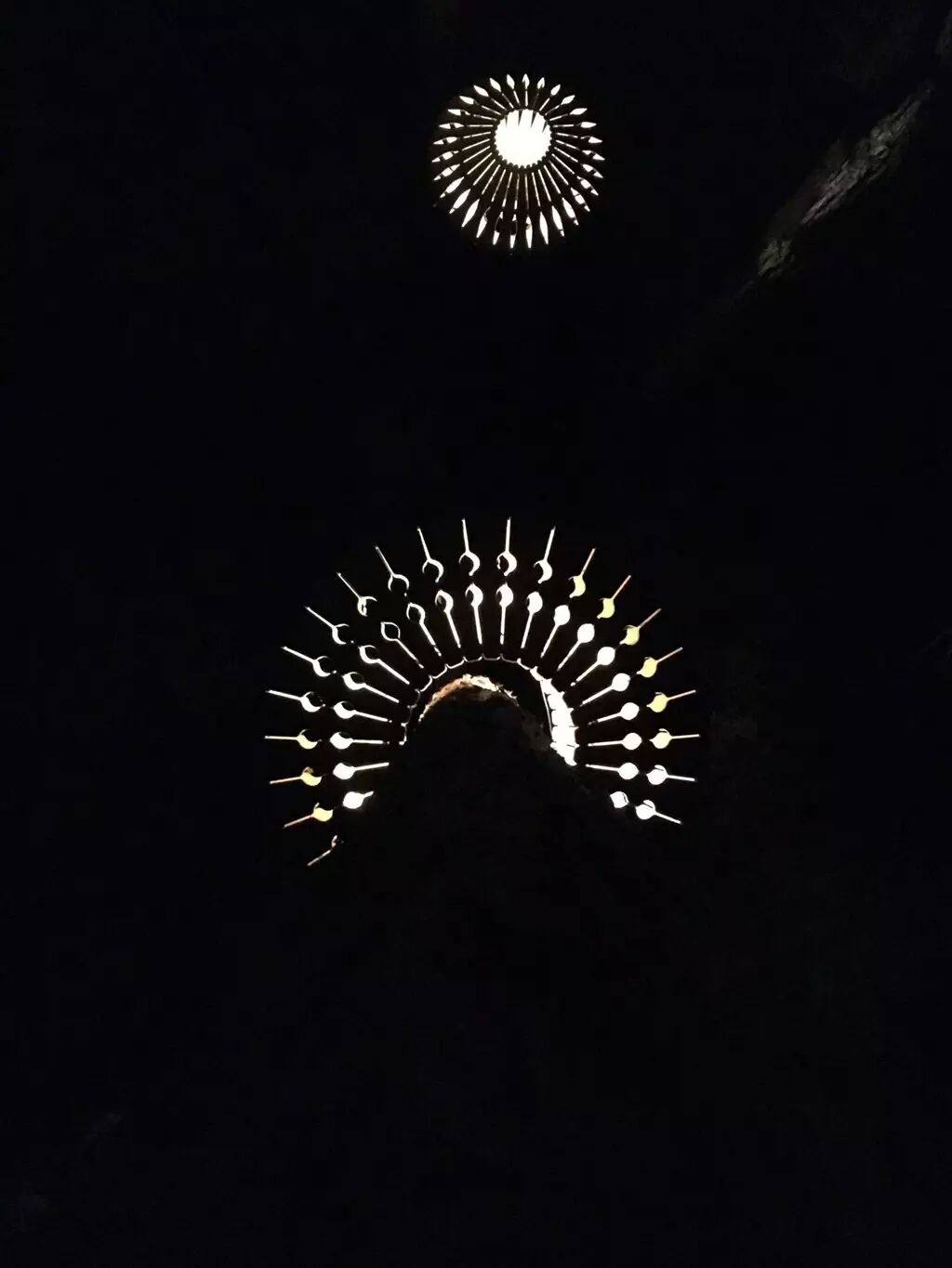 继续前行,林木间出现形状各异的灯。或许是考虑到持久性审美,灯的形状设计很简单,线条明快,光从其中透出来,通过外廓形成规律的影子,非常适合拍照。连映射到地面上的暗影都呈艺术的发散型,也算是匠心独具了。除了悬挂着的吊灯之外,在地面上还有几种不同颜色的脚灯,自下而上,或蓝或红或绿,不过说实话这有点象《西游记》里妖精的洞府,略显恶俗。要是再加点干冰效果就更逼真了。