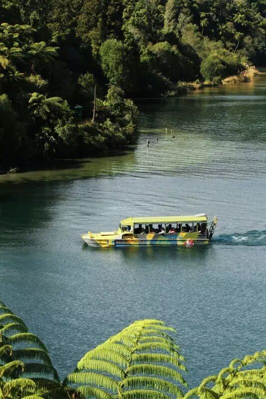 除了飞机,乘坐鸭子船游湖也是个好选择。鸭子船其实是水陆两栖船,可以在公路上行驶,也可以开到水上泛舟。宁静的湖面被色彩鲜艳的船划开扩散着水波,也是件令人神清气爽之事,湖光山色两相宜。