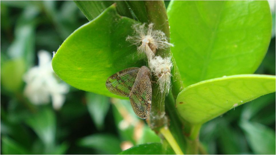 8. 叶蝉(Passion Vine Hopper)。附于植物枝叶上吸食汁液,危害多种果树,成虫在触碰会迅速跳走飞走,幼虫状态没有翅膀,在11月幼虫期喷洒含Pyrethrum的农药