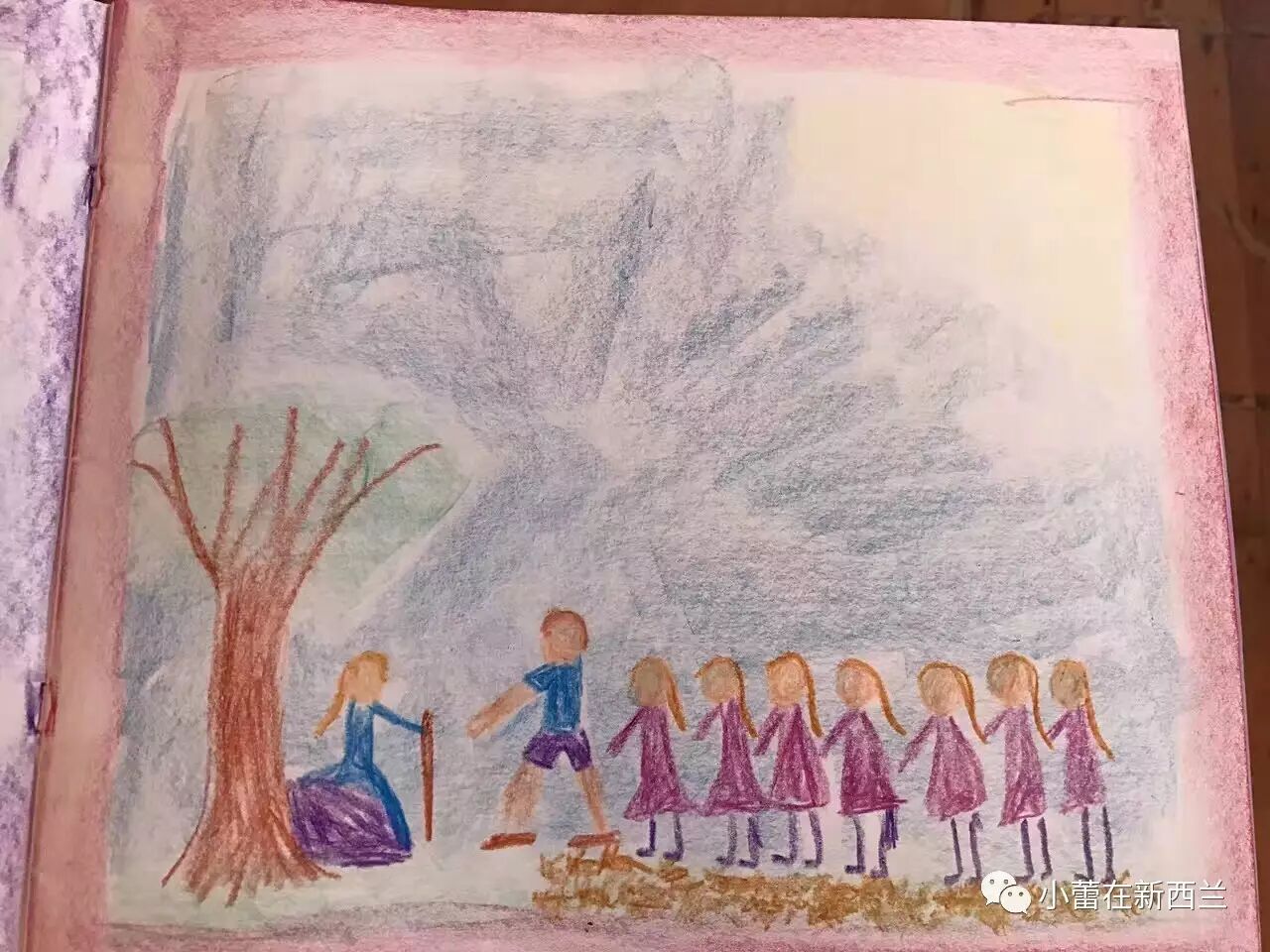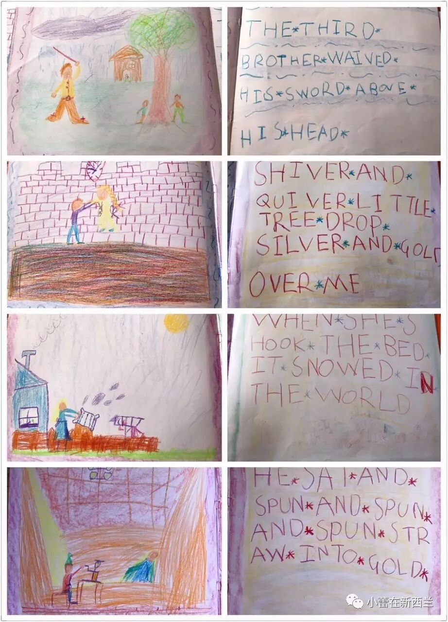 最后大概两周,不再学字母,而是一边听故事,一边画画,一边写。故事依然以格林童话为主,《灰姑娘》《名字古怪的小矮人》《Mother Holle》……