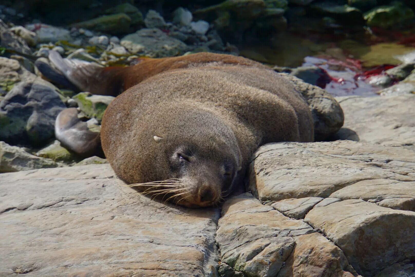 在凯库拉的基恩角海豹栖息地(Point Kean Seal Colony),数十只甚至上百只海豹会聚集在这里,就这样懒懒的爬在礁石上一动不动的晒太阳。是真正的“一动不动”。 难得有几只抬起头来,用无辜的小眼神儿看看岸上,换个姿势再继续睡。