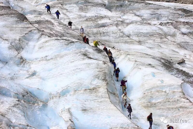 这2个冰川本质上没有太大区别,我的冰川徒步是在Fox Glacier走的。冰川的玩法都差不多:徒步、直升机以及攀岩。攀岩需要专业技能,不可轻易体验。如果预算足够,还是飞上去吧,因为徒步走的到的地方,看到的冰川全是被石头灰土盖住的,黑乎乎的,全天徒步吃午饭就像是丐帮坐在冰川上办party。宣传册上拍出的那种湛蓝湛蓝的冰川景象,只有飞上去才见得到。
