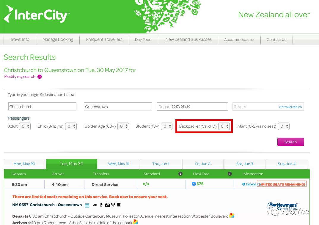 南岛各大城市之间最常见的大巴公司:Intercity(网址:https://www.intercity.co.nz/)这里基本上需要落脚的城市都能可以乘坐。