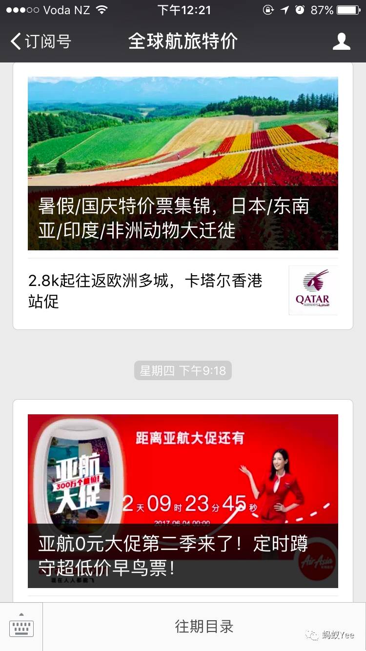 推荐一个特价航班公众号:全球航旅特价。它经常推送一些限时特价机票,消息很及时。